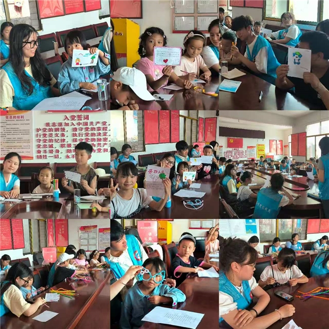 在与乡村孩子们的互动中,实践团成员引导小朋友用画笔和文字表达内心的感谢,在色彩与文字的世界里,孩子们尽情抒发着情感。随后,大家围坐在一起,学唱歌,激昂的歌声传递着团结与志愿精神。歌声落下,游戏环节又带来阵阵欢笑,成员们还教孩子们用扭扭棒制作各式小物件,让创意与快乐在孩子们的指尖绽放,为乡村儿童的暑期生活增添了一抹亮色。